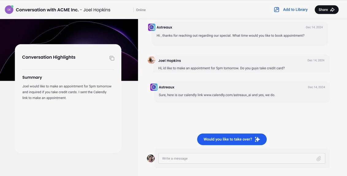 Astreaux handles the entire conversation—qualifying the lead, answering questions, and guiding them toward booking an appointment. You watch it happen, the tool does the work.